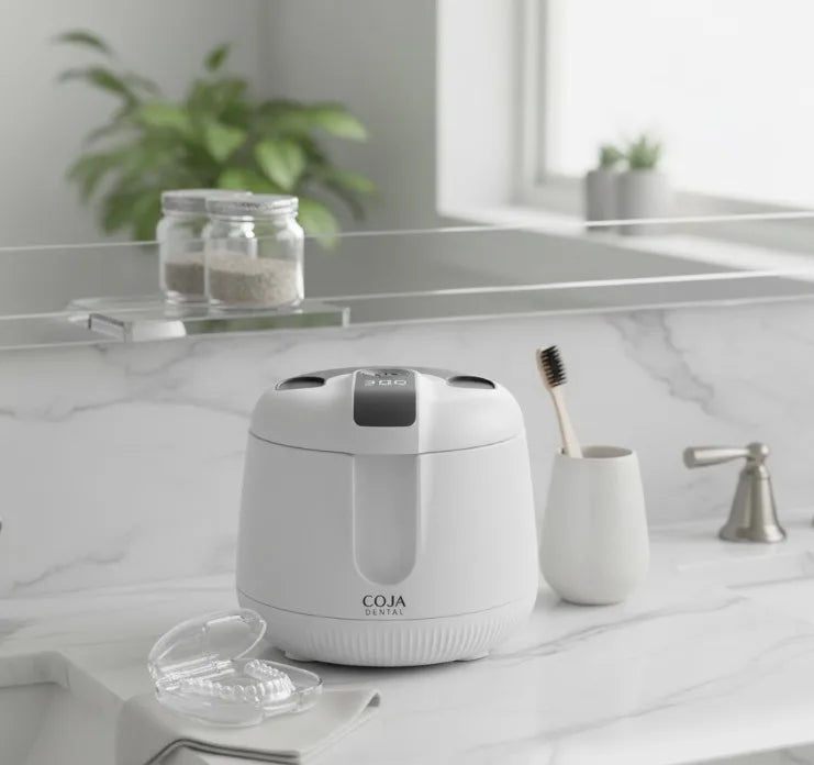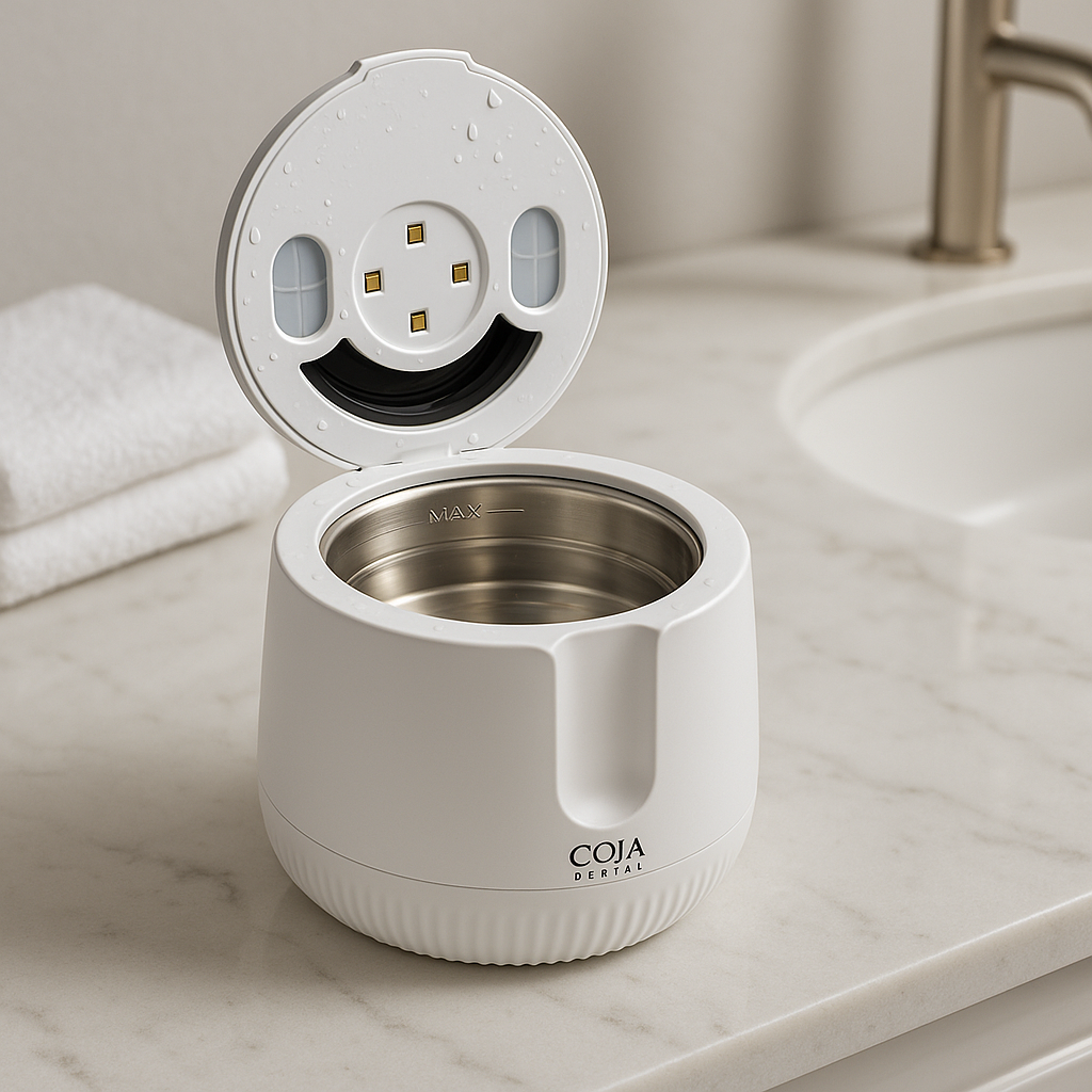 COJA combines ultrasonic vibration with UV sterilization to eliminate debris, odor, and bacteria that soaking or brushing alone can’t remove. Each cleaning cycle uses high-frequency sound waves to deliver a lab-grade clean.